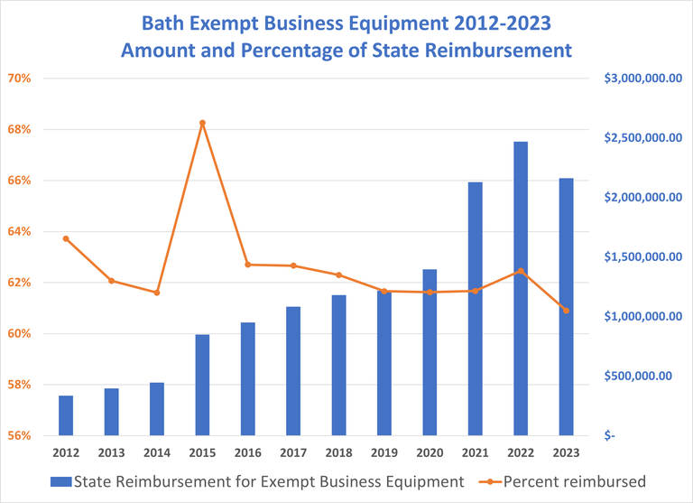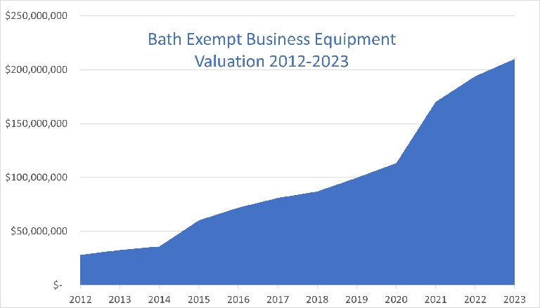 Bath's exempt Business Equipment is valued at over $210 million in 2023. The State Business Equipment Tax Exemption (BETE) program includes most new (since 2007) business equipment at non-retail businesses. The State of Maine reimburses the City of Bath for a portion of the tax revenue lost from the exemption.