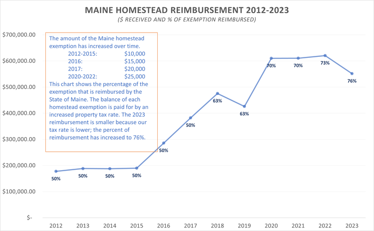 The homestead exemption is a popular and valuable way to reduce the tax burden for Bath residents and homeowners. Recently, the State Legislature has passed a plan to increase the amount of State reimbursement to the towns for the loss in revenue from the homestead exemption. The number of homestead exemptions varies each year, but in 2023 we have 1,718 homestead exemptions and will receive $551,650 in reimbursement. However, all Bath property tax payers pay an additional $10 for every $100,000 in their valuation to make up the $174,205 balance of lost tax revenue due to the unreimbursed homestead exemption.