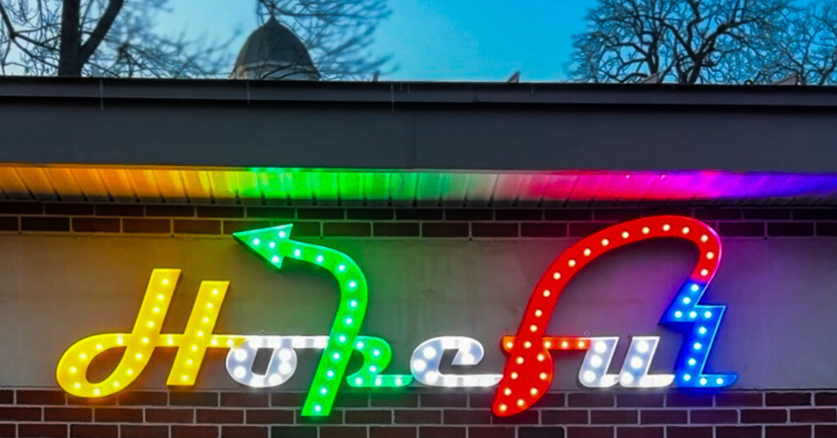 Artist Charlie Hewitt began The Hopeful Project, 2019-present, with a single lighted aluminum sculpture commissioned by Speedwell Projects for the roof of their headquarters in Portland, Maine. “Maine is a dark place in the winter,” Hewitt said, “and I felt compelled to illuminate that corner of our world with a message of hope.”