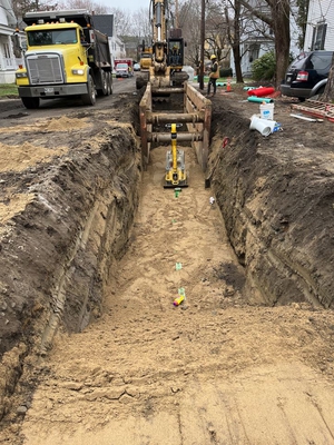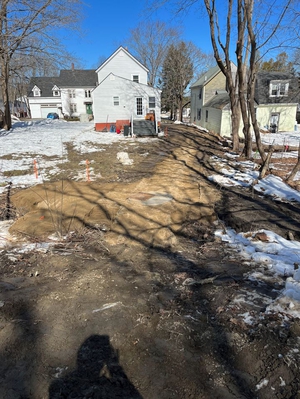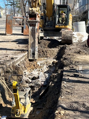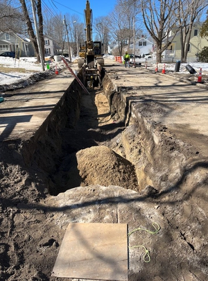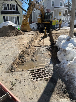UPDATE - MARCH 17, 2023 - The contractor performed tree cutting in the work area. Storm drain installation began at the downstream end by making a new connection to an existing catch basin on Bedford Street. Pipe was then installed from Bedford, through two backyards, to Oak Street. The pipe run continued west on Oak St. Several new manholes and catch basins were installed. Current work is to connect two existing catch basins on Oak Street to the new storm drain. Removal of ledge, and a layer of concrete pavement, was required.