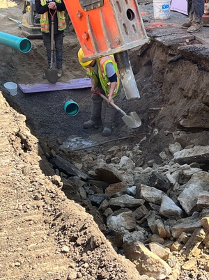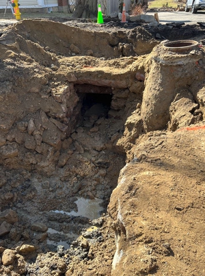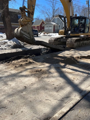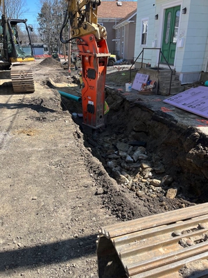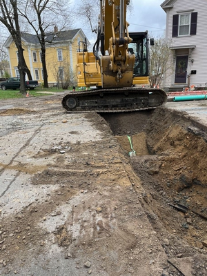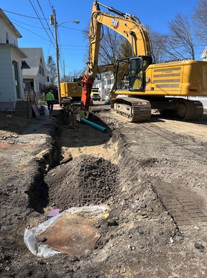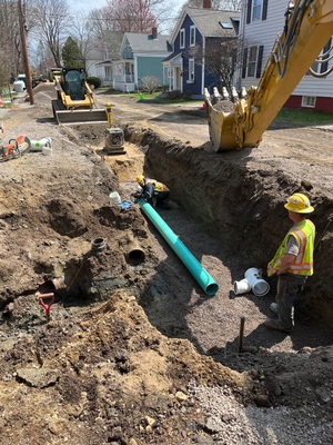 UPDATE - APRIL 6, 2023 - The contractor completed new storm drain installation from Bedford Street to Oak Street. Two existing catch basins on Oak St were disconnected from the sewer and connected to the new storm drain. A section of sewer across Oak St that was constructed of chunks of stone was replaced with a plastic pipe. A new sewer manhole was placed in this area. Work then shifted to Green St. The existing road pavement and sidewalks was milled away. The sewer at the east end of the street was replaced. Ledge removal has been required to install the pipes. A test pit was conducted at the west end near Lincoln St to determine how plumbing connections could be made around other utilities. A previously unknown section of stone channel was discovered along the existing 18-inch sewer crossing Green St. The stone channel was excavated, a manhole placed in the middle of the street and new sewer pipe was connected at both ends to the existing pipes. This was a deep and delicate operation around retaining walls and trees that required a lot of on-the-spot creativity and problem solving.