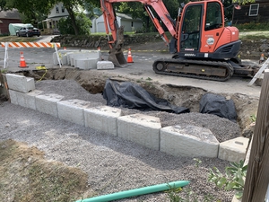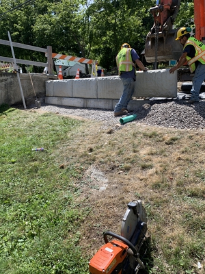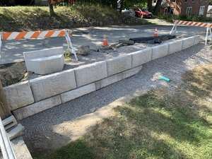 Regarding the retaining wall replacement, the project started with excavation of the existing, northernmost retaining wall. The new wall blocks have been placed and the wall has been backfilled. Work is now progressing on the second wall. The existing wall was excavated and the first layer of new wall blocks is in place. Work will continue southward. After the walls are completed, the sidewalk and road pavement will be removed and replaced.