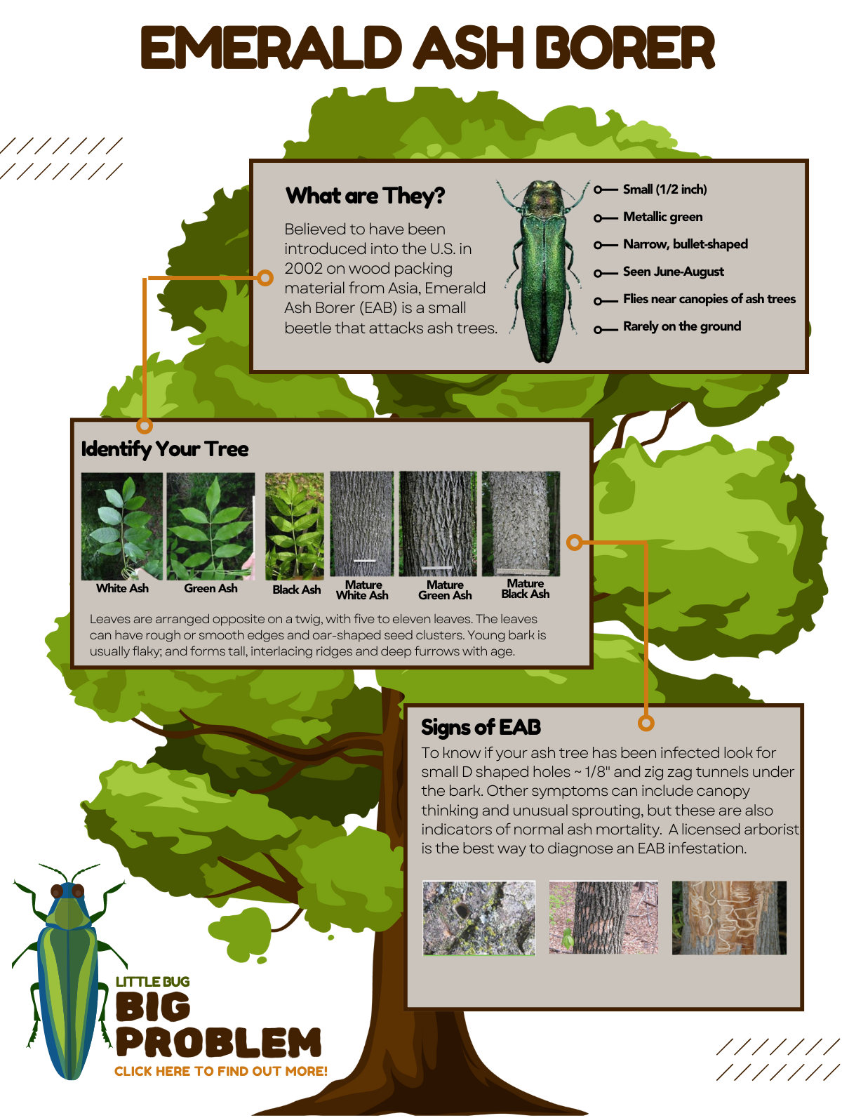 The emerald ash borer (EAB), Agrilus planipennis, is one of the most serious invasive species threatening our ash resources and forests. All species of (Fraxinus) ash trees, but not (Sorbus) mountain ash, that grow in Maine are susceptible to injury and death by the emerald ash borer. EAB was first found in Aroostook County (Madawaska, Frenchville, and Grand Isle), and York County (Acton, Berwick, and Lebanon), ME in 2018. It was detected in Cumberland County (Portland) in September 2019 and in Sagadahoc County in October 2024.