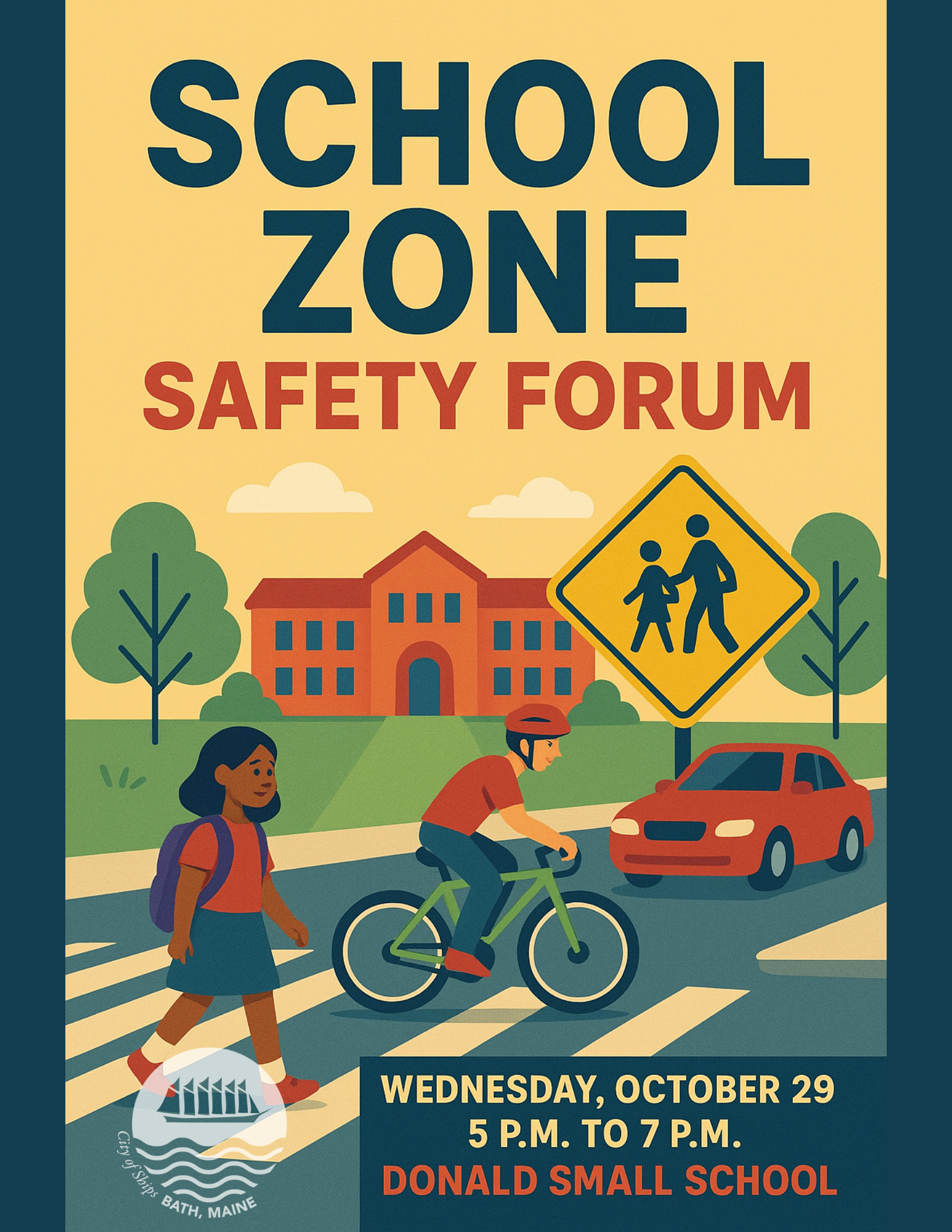 The City of Bath invites you to a School Zone Safety Forum on Wednesday, October 29, from 5:00 p.m. to 7:00 p.m. at the Donald Small School gymnasium.