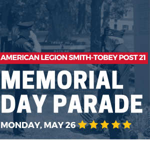 The American Legion Smith-Tobey Post 21 is again planning a Memorial Day parade and ceremony on Monday May 26th 2025 with a parade start time of 10:30am. The route is the traditional parade route down Lincoln St to Centre St to Front St. ending at the Library for the traditional wreath laying ceremony