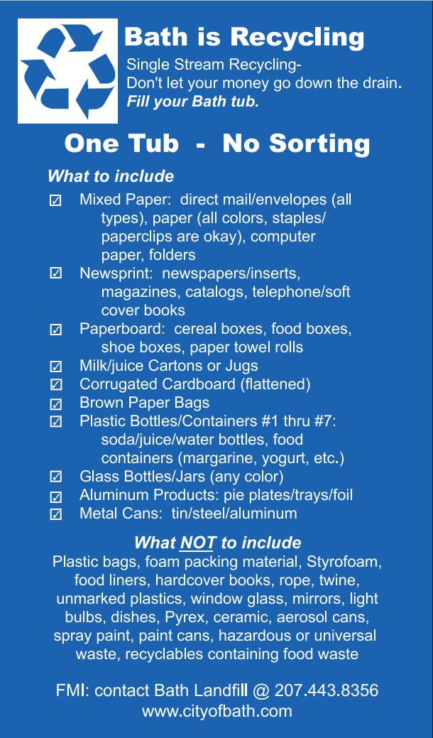 If you still have questions about what or how to recycle something you have, try using the Ecomaine Recyclopedia. The City of Bath does now uses Ecomaine, a waste-to-energy and recycling plant in Portland, for solid waste services. The extensive collection of recycling information assembled by Ecomaine can be a great resource when you have something that seems outside the regular list of recyclable materials.